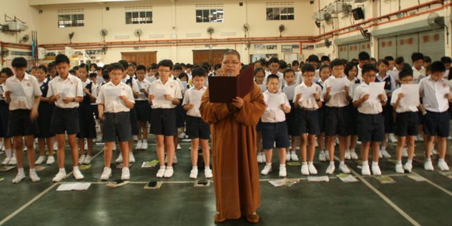 鄭修得校長致詞時表示,我們是多元種族的國家,今天我們請到了東禪寺法師帶領大家浴佛祈福,是為了讓大家增加知識並非傳教,也借此機會為六年級考生祝福及建立考試前的心里建設。
