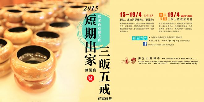 佛光山東禪寺將於4月15日至19日(星期三至日)舉辦為期五天的「短期出家暨三皈五戒修道會」,至今巳邁向第十二屆,所謂受戒功德殊勝行,歡迎有心人士直接瀏覽 www.fgs.org.my 綱絡報名。