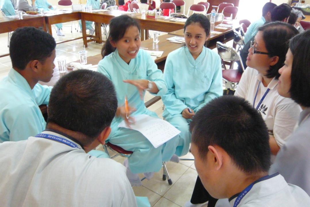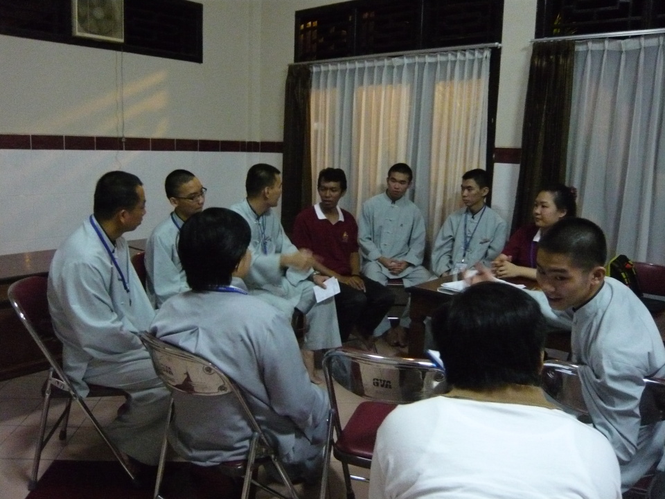 當晚,東禪佛教學院學生與菩提達摩精舍的學生分組交流,在分享彼此的學習心得和兩地文化差異,過程充滿歡笑聲,雖然語言有異,大家依然樂在其中。