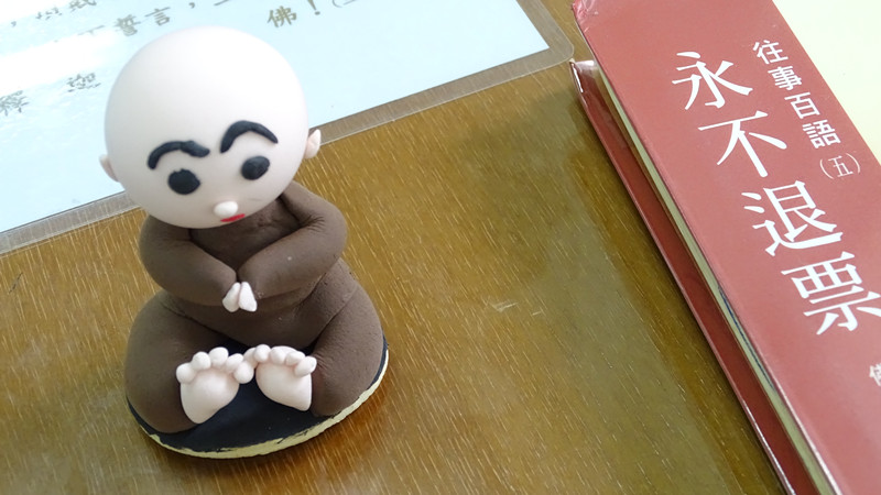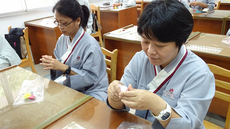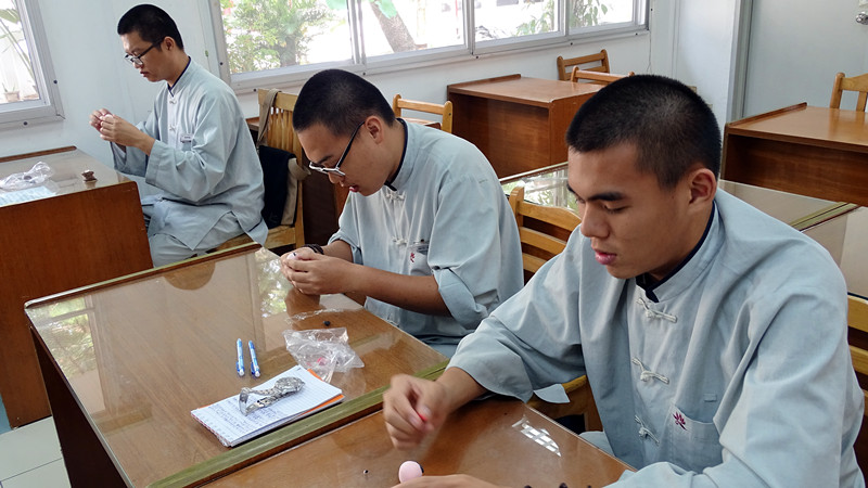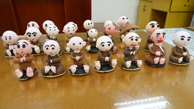 巫俊德夫妇以基本的涅面颜色为黑、白、红、黄,指导同学如何捏出一个小沙弥。同学在了解调色原理之后,调配出小沙弥所需要的肤色与衣服的颜色。在捏面过程中,同学们从中学习调伏不耐烦的心态,把心放柔软,细心地用巧手几经捏、搓、揉、点,各别捏出属于自己特色的小沙弥,每一个作品的神情各异、讨喜可爱,让课堂顿时洋溢着欢喜和谐的气氛。