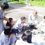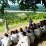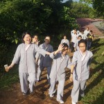 此參學促進同學彼此聯誼,同學們一路有說有笑沿著那蜿蜒的山路陸陸續續的朝山上邁進。抵達半山腰時,一眼望去的是一條像蟒蛇般的河流穿插在那一片綠油油的田野中,緩緩地流向大海,同學們在大自然及清新的鳥叫聲中,頓時平撫了浮躁的心。看到如此美好的風景,如音老師帶領大家唱起了人間音緣歌曲〈山水妙路〉、〈誰念南無〉等。老師們勉勵同學學習『隨緣不變,不變隨緣』的性格。凡是不要隨波逐流、沉淪苦海、無法自拔,對五欲六塵能不貪不拒,才能擁有和諧的人生。