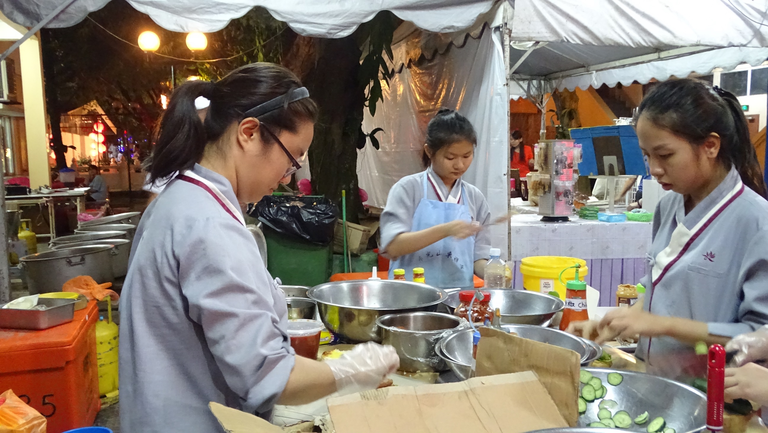 美食街人潮擁擠、摩肩擦踵,叫賣聲、鍋鏟聲不斷,人們的情緒難免浮躁。若能給予信眾從容大方的微笑,即能緩解人們浮躁與緊繃的情緒。同樣的,要是組員百忙中弄錯食物種類與數量,一個微笑或一聲“沒關係”,便能安撫同伴們的焦慮,讓彼此緊繃的心情輕鬆自在。
