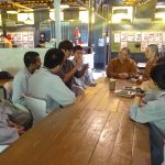 隨後,老師又帶領同學們前往1969文創藝術館瞭解仁嘉隆華人新村的發展史,這是一家藝術與歷史加素食館三合一體文創館。藝術家Pireer 與大家分享文創館的設計理念源於東禪寺平安燈會的創作,因此與東禪寺結下因緣。如何將環保與藝術結合、廢物再利用、垃圾變黃金的生態思想,也讓Pireer老師找到文化傳播的視窗,並提供一個平臺給青年藝術的創作者,這是他覺得最有意義的事情。有著豐富經驗的Pireer老師從藝術中體悟人生,強調無論做事做人要從基礎做起,腳踏實地,一步一腳印,必將前途光明。