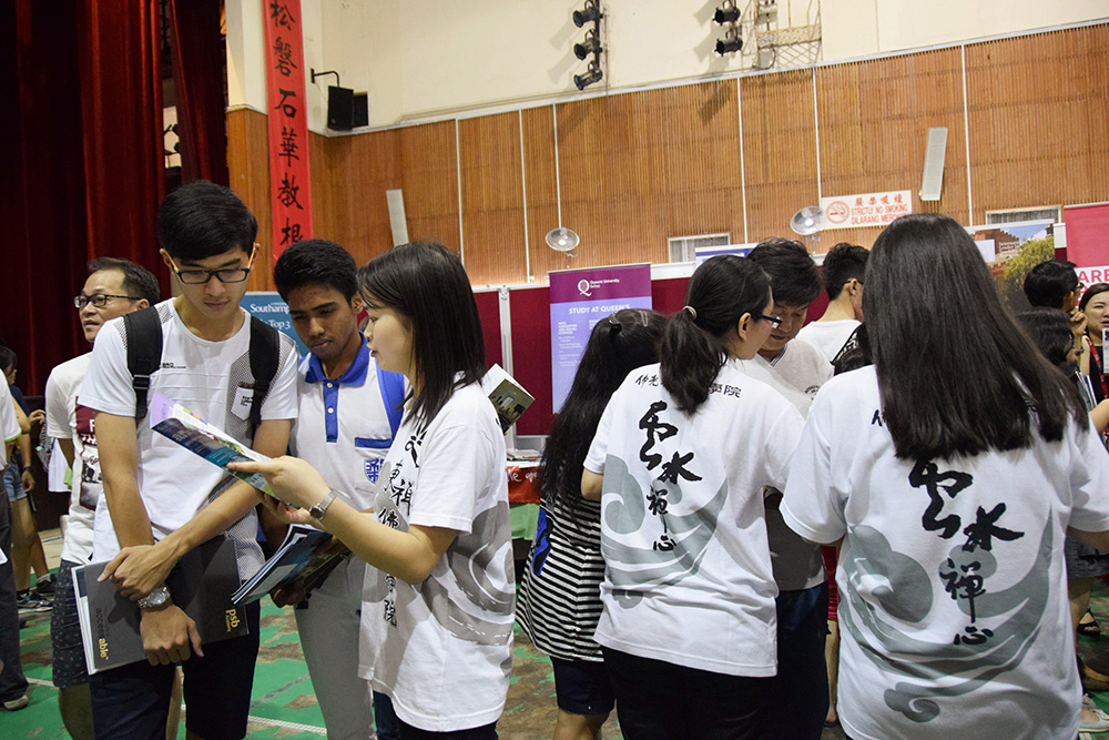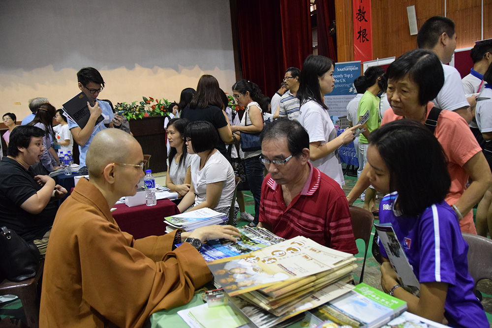 上午10时,全体师生抵达柔佛新山宽柔中学大礼堂,参与2016年度『海内外大专院校升学辅导展』。升学展由来自中国、英国、美国、奥大利亚、韩国、新加坡、香港、台湾、马来西亚本地等海内外大专院校42所著名大学参与。周日班同学与老师发挥三寸不烂之舌为佛光山五所大学及佛学院播撒菩提种子,让莘莘学子们在未来的学习中有更多不一样的选择。