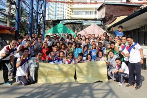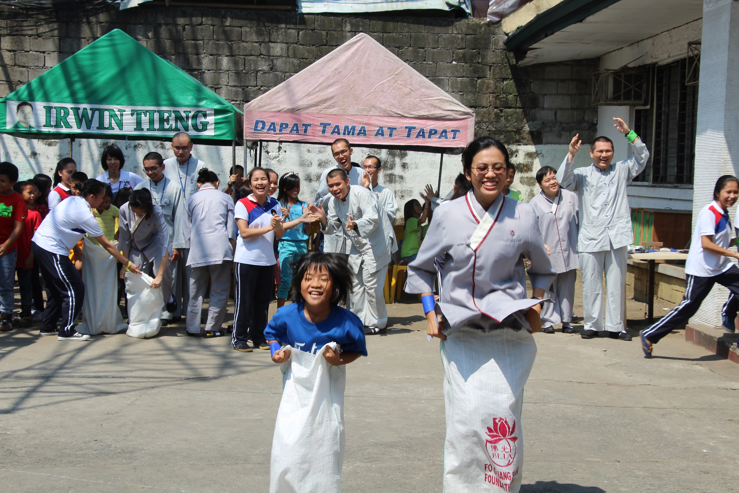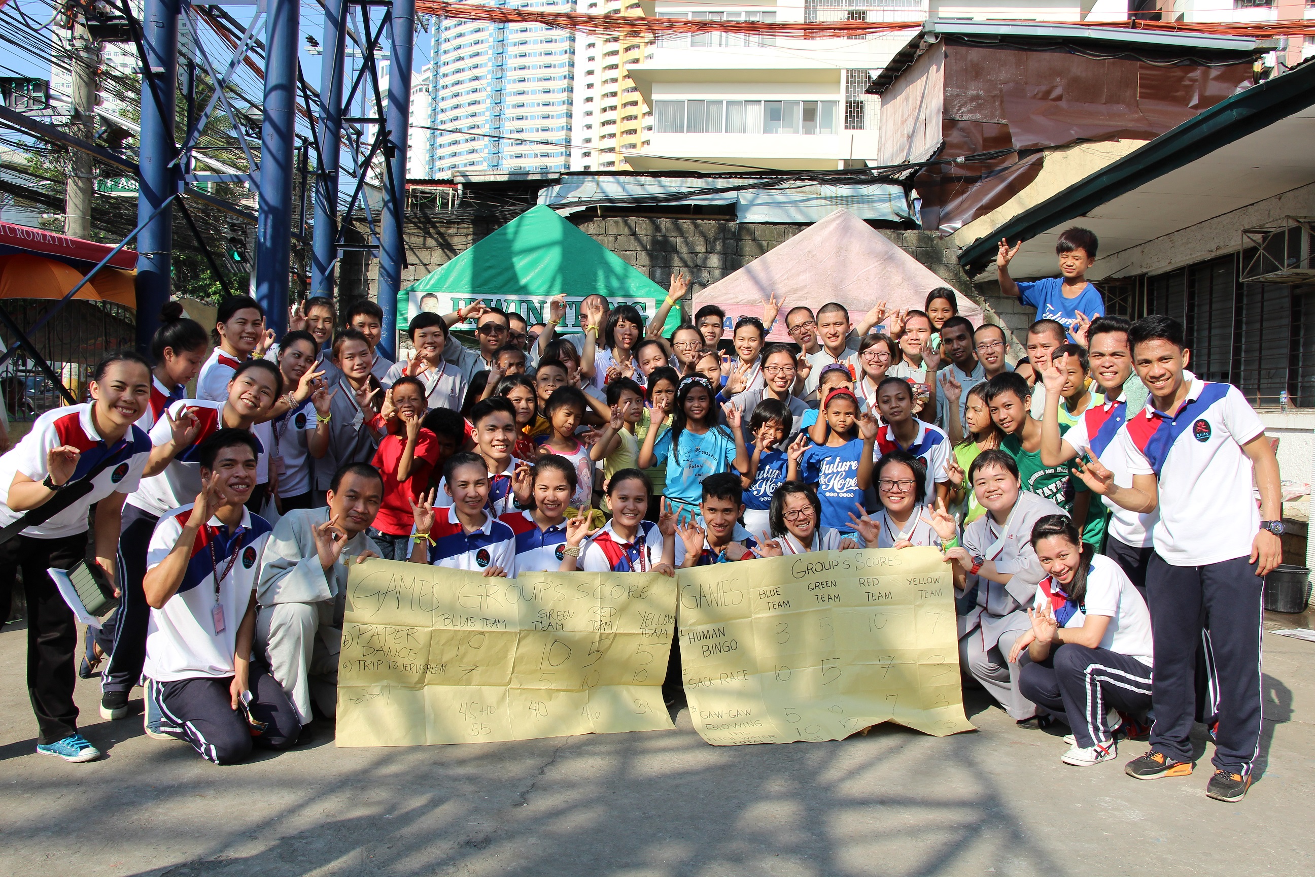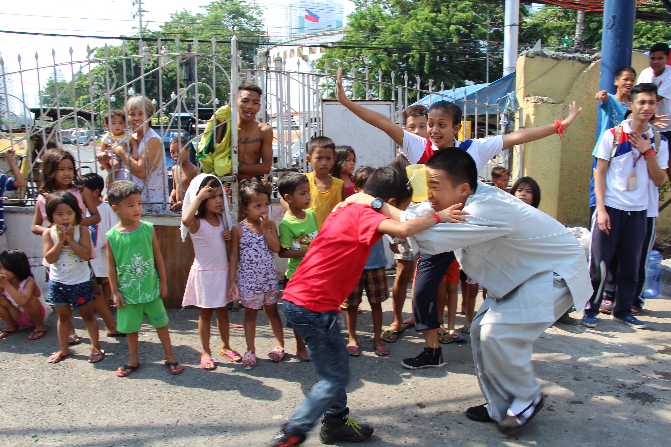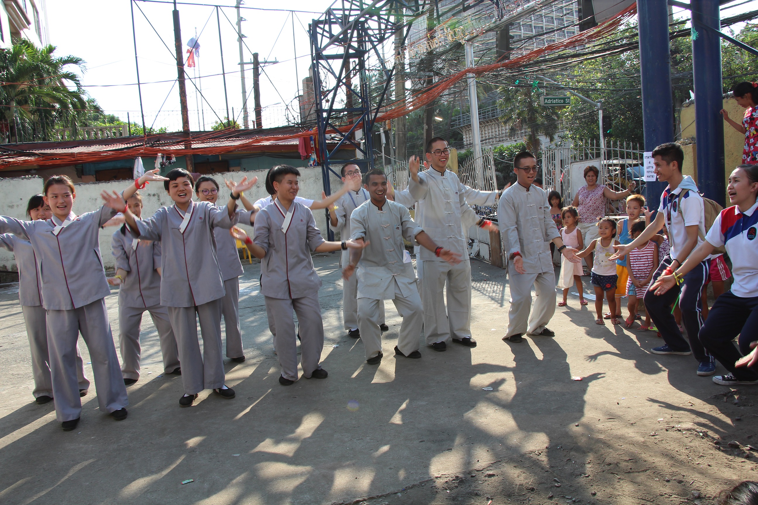 同學們與一群年齡介於10歲至12歲的小孩進行小遊戲,包括跳麻袋、頭頂運水、音樂椅、吹麵粉等。菲律賓小孩們的天真與活力很快就與同學們打成一片,就算頂著大太陽,大家都還是玩得不亦樂乎,增進了彼此的感情。遊戲後,同學們除了分發餅乾與小禮物和小孩們結緣外,也表演了兩首菲律賓民謠給大家。雖然孩子們在不理想的環境中生活,但他們還是展現最真實無邪的笑容。Maru老師也表示,貧民窟的居民雖然面對的是衣食住行的欠缺,但我們的出現能夠給他們帶來無限的歡喜與幸福。