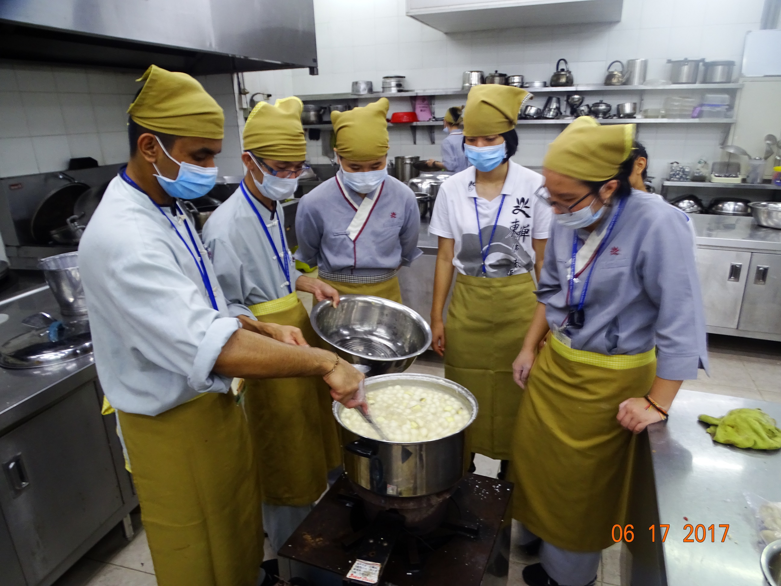 東禪佛學院學生除了學會烹調自己的美食外,這次的旅程也要感謝菲律賓常住讓同學們能有機會學習製作當地的甜點,有Halo-Halo,Bilo-Bilo,以及Pichi-Pichi。同學們在光明大學學生的帶領下,到附近的聖安德魯菜市場(San Andres Market) 親自採購食材。最有趣的是,同學們得用菲律賓語與攤主做買賣上的溝通。對於這份難能可貴的體驗,同學們都興奮不已,在烹調的當兒也充滿無比歡樂。
