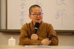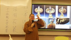 如常法師先從各個朝代、各國觀音菩薩造像作了專業分析,再從藝術、菩薩化身等向同學介紹觀世音菩薩的歷史背景,讓大家瞭解觀世音菩薩來自於印度,是過去正法明如來,早已成佛,法身遍滿三千大千世界,為了救度眾生而倒駕慈航,成為現前觀世音菩薩,更是阿彌陀佛的脅侍菩薩之一,菩薩以三十二應化身度脫眾生。