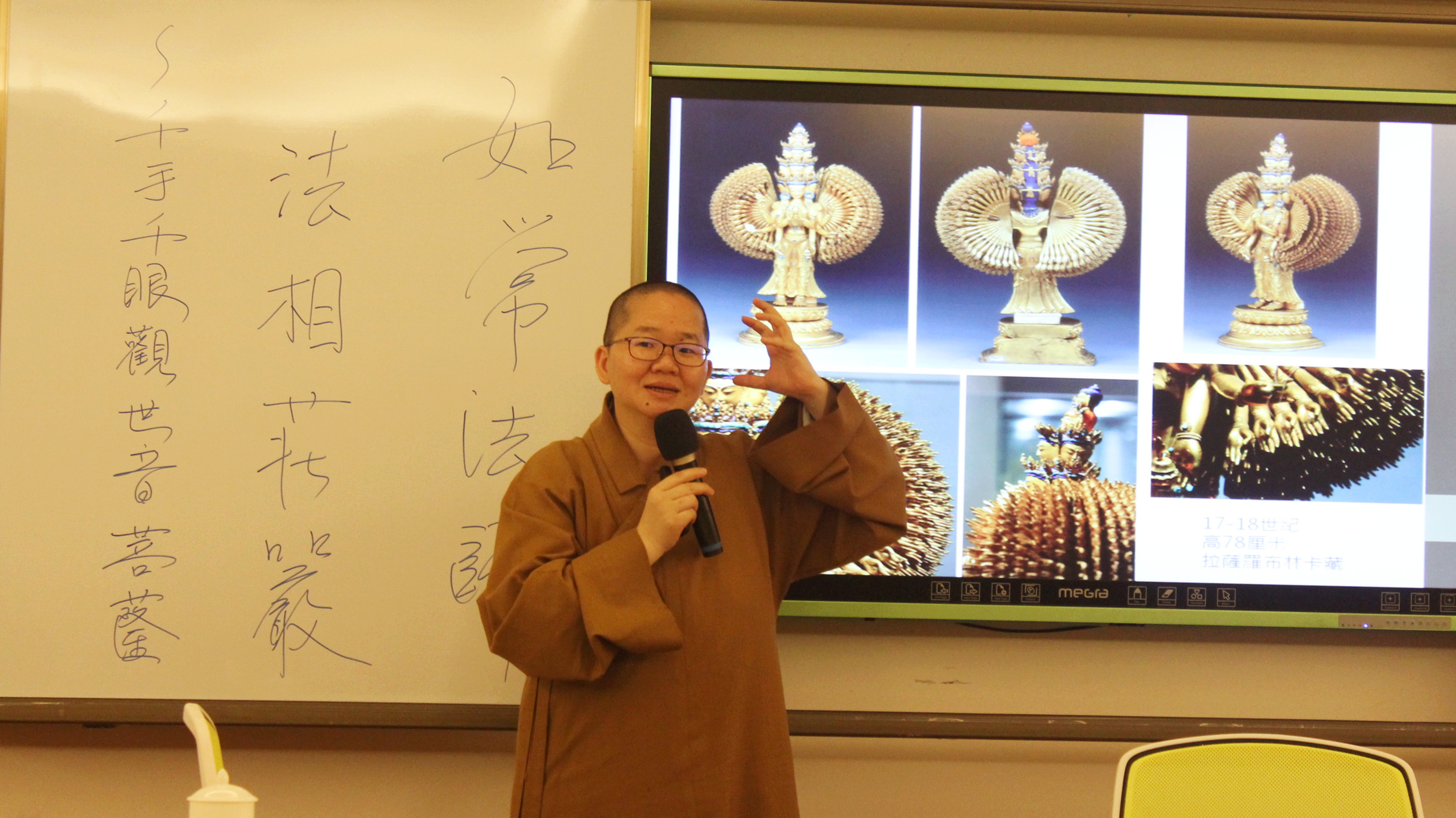 如常法師先從各個朝代、各國觀音菩薩造像作了專業分析,再從藝術、菩薩化身等向同學介紹觀世音菩薩的歷史背景,讓大家瞭解觀世音菩薩來自於印度,是過去正法明如來,早已成佛,法身遍滿三千大千世界,為了救度眾生而倒駕慈航,成為現前觀世音菩薩,更是阿彌陀佛的脅侍菩薩之一,菩薩以三十二應化身度脫眾生。