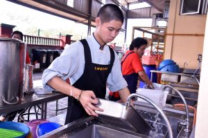 二月十四日,當平安燈會啟燈典禮掀開序幕也意味著新春義賣活動開跑。同學們穿上圍兜、手套、帶上衛生帽,搖身一變成了各檔口的“小老板”。開檔第一天,只見大家手忙腳亂,畢竟是新手,很多東西都不熟練,但那份認真服務與學習的態度真讓人感動。