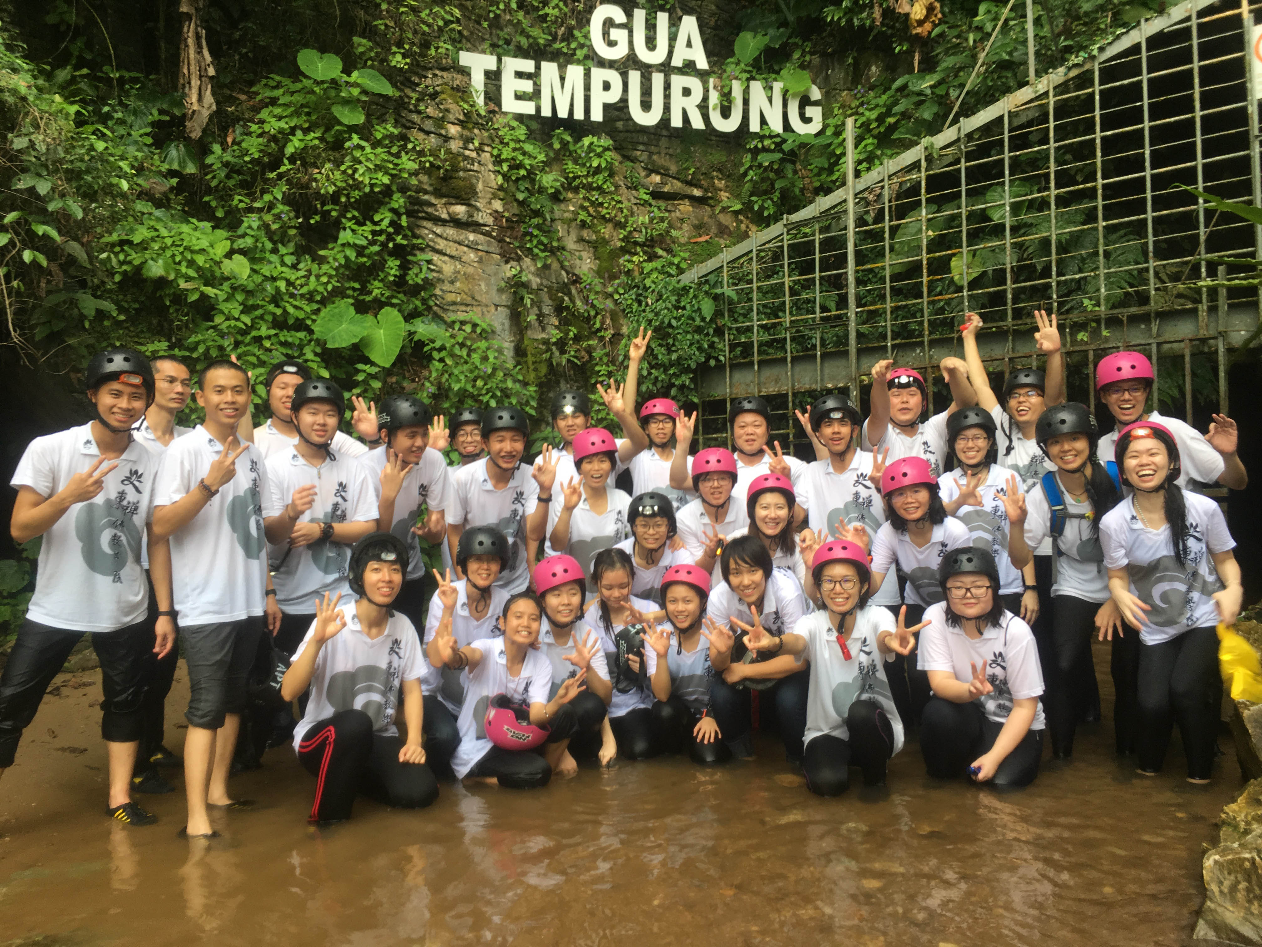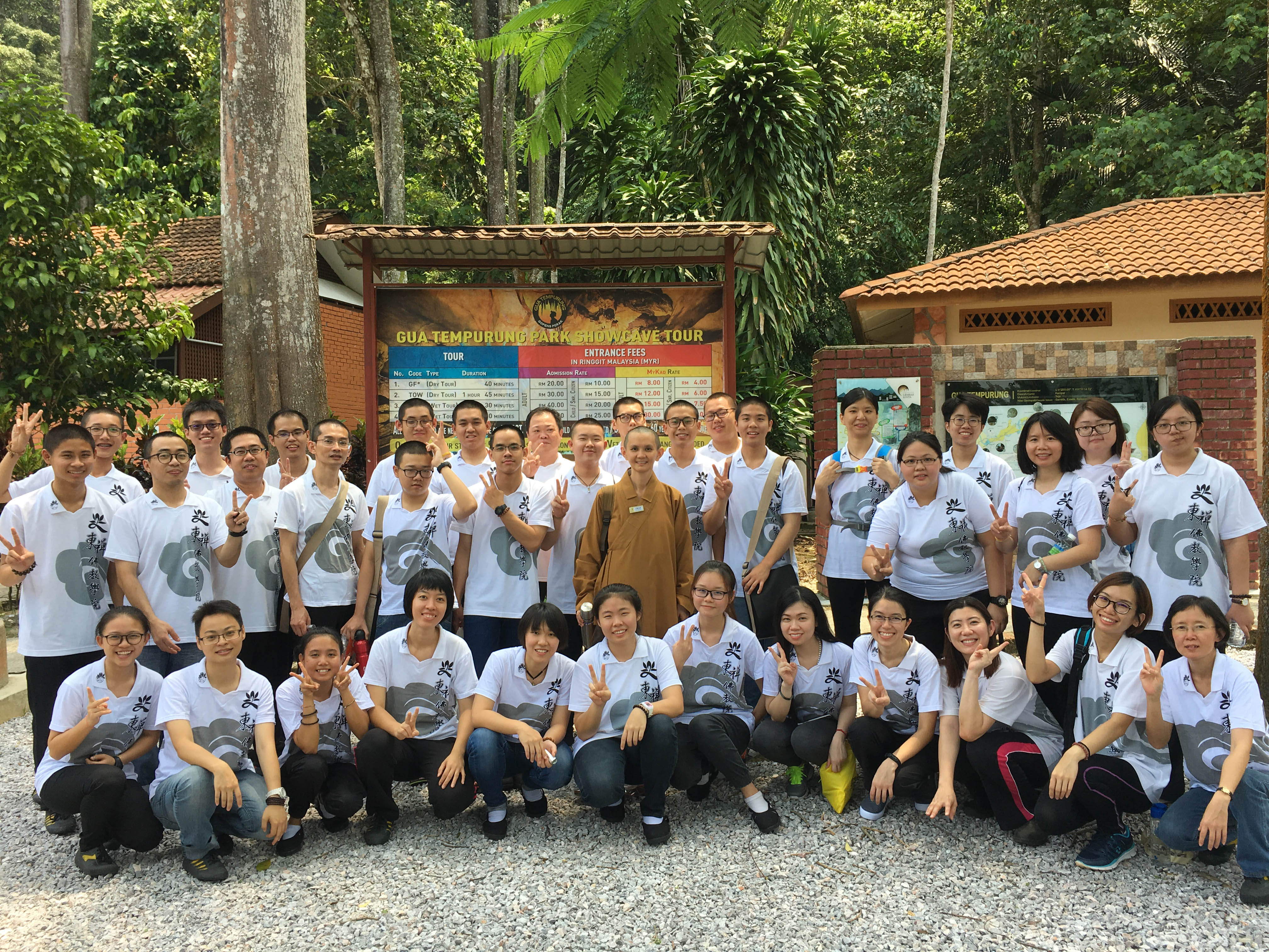 18日午餐后,在怡保禪凈中心的安排下,全日制與周日班同學一起探索了約4億年歷史悠久的山洞—–椰壳洞。妙豪法師帶領大家誦經回向后,在两位導遊的帶領下循着台阶在洞中观赏形态各异的钟乳石,導遊一再强调每一柱钟乳石的形成都经历了数以百万年的漫长岁月,因此教育所有前来参观的游客必须好好珍惜大地的恩泽,不随手破坏这珍贵的自然遗迹。