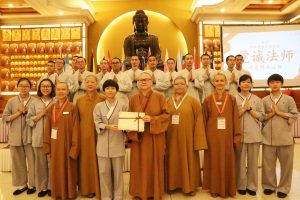 图:院長覺誠法師頒發結業證書予同學們并與全體師生合影