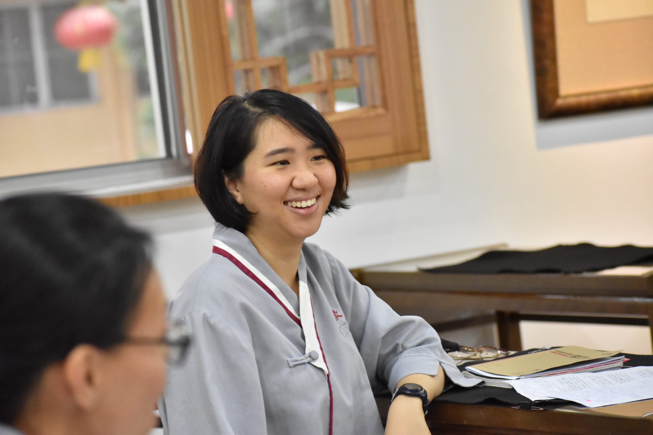 我與另外三位同學系在一起完成了各項任務課程,並非啥夥伴間的老土話“我們心系一起”之類的,四人的左手腕被綁在一起了,上廁所都來個同死共生。撇去行動上的不方便,我切身體會到佛光山宗風之一,即集體創作的力量。當我被委任當“媽媽” ,我確實感受到承擔責任的重壓,可是壓不跨我,如同拿石壓水,藏在我身軀的力量被逼著溢出來了。