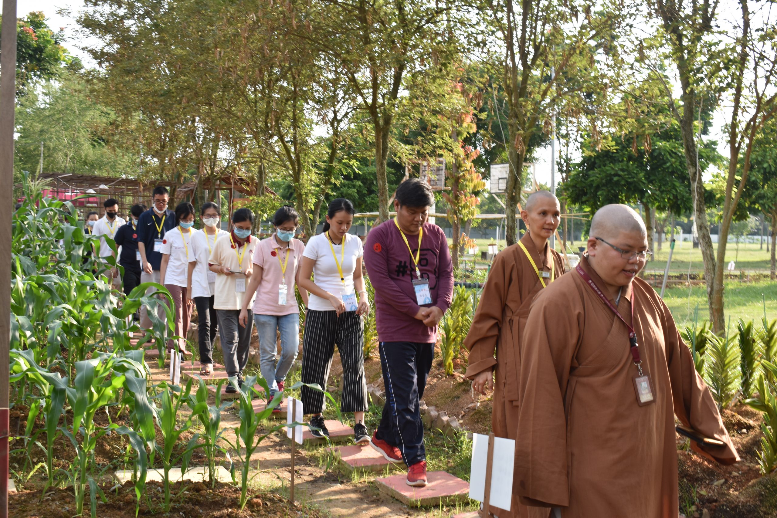 學院三位法師除了帶領小組交流外,也帶大家前往參觀疫情期間開發的東禪清淨農場,農場負責人慧護法師說「在耕種的路上,除了發心還要出力,以此勸勉線上佛學院同學在學佛的道路上,跳出線上框框,確實踐行佛法。」