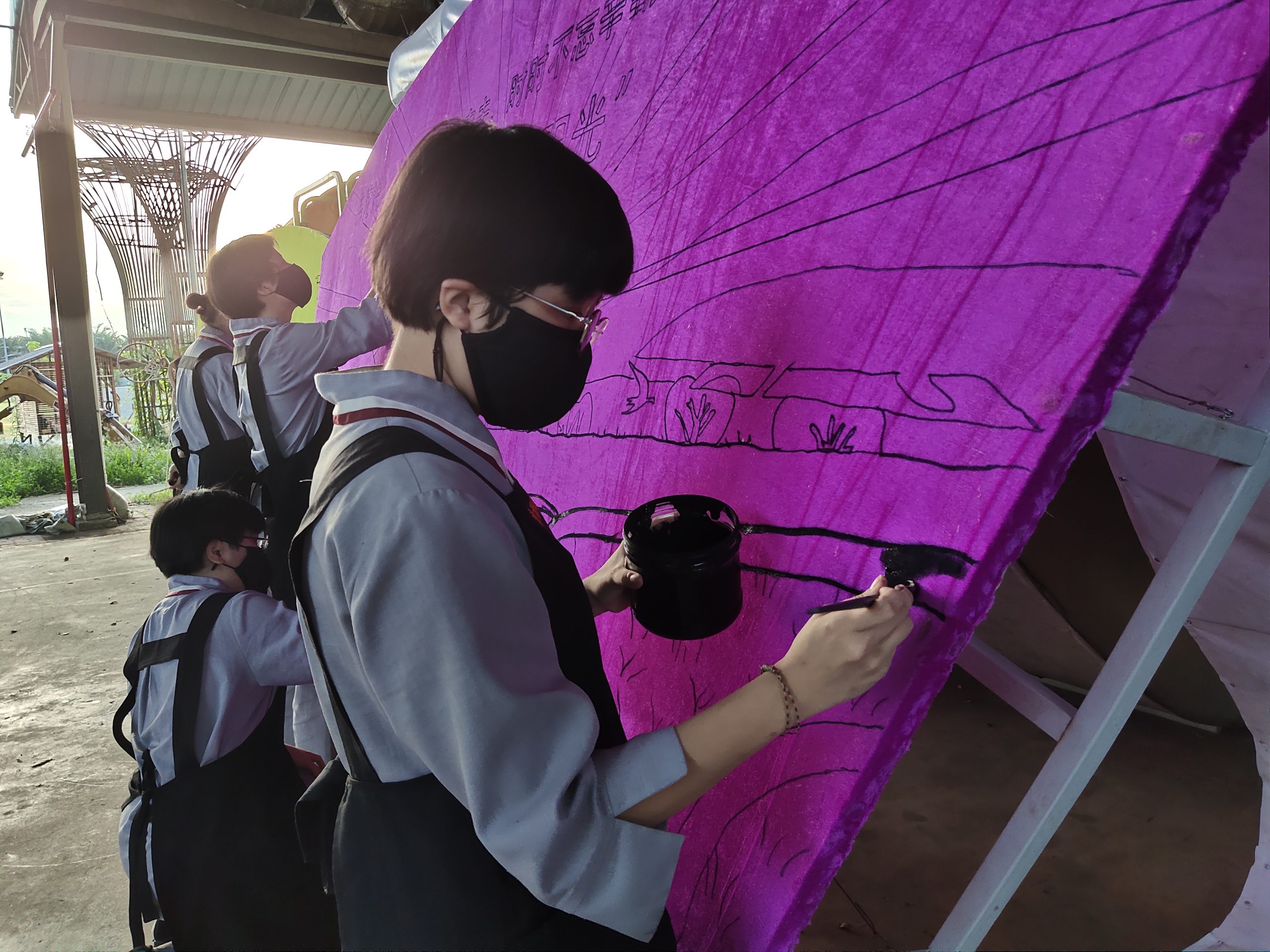 老師透過投影機把電腦中的圖畫照射在布畫上,我和同學們開始用馬克筆把投射出來的圖畫畫在布上。我們所畫的景象是一片稻田。稻田裡有農夫、水牛、小沙彌等等。