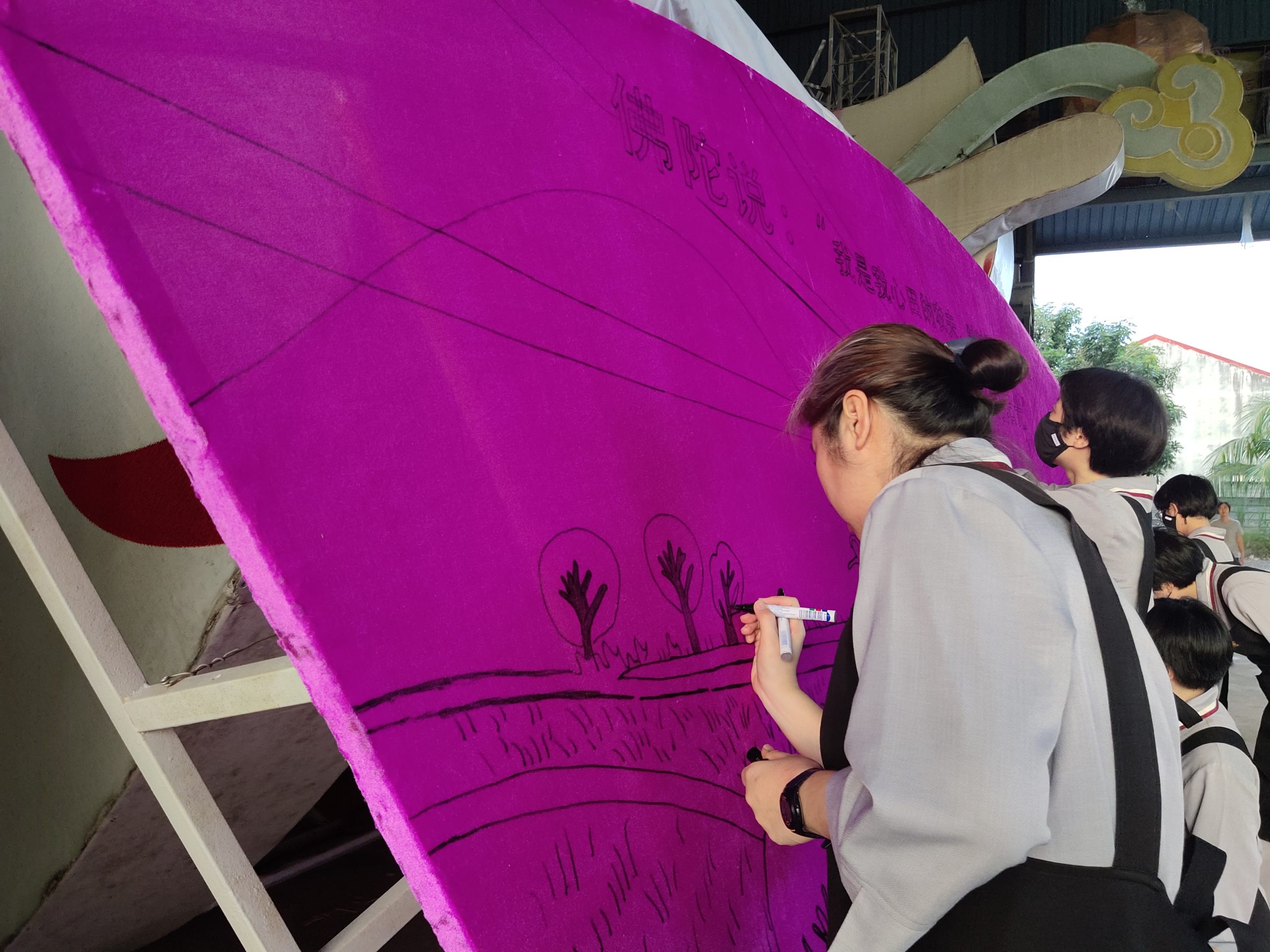 為了迎接今年平安燈會,我和同學一起協助完成10幅佛典故事的布畫圖。老師先把我們分做兩組,一組負責描圖,一組負責彩色。第一天我負責描圖,第二天則負責彩色。在描圖時,我需要靜下來慢慢地一筆一字的描好,這讓我想起星雲大師曾經說過,做事要一步一腳印,才能把事情做好。