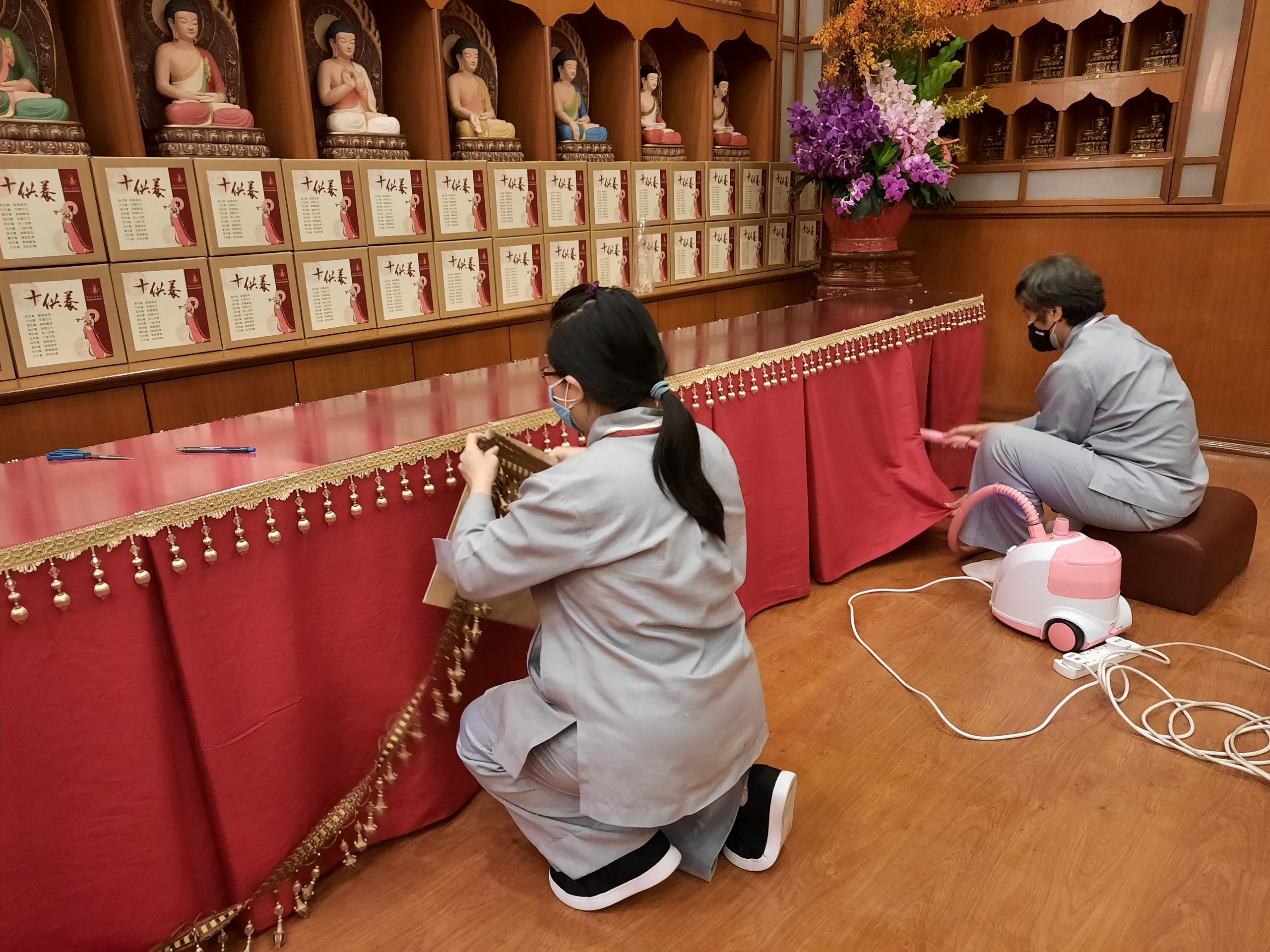 從這次的法會中,跟著老師學習捏布,把一條長布捏好,並用釘子和大頭針把它釘在桌子四周圍,這可考驗著我們的忍耐力與「拇指神功」。捏布三部曲,測量桌子、選布、燙布,每一個步驟都須做到一心不亂,否則被大頭針紮到,那疼的感覺還真是紮心。看到一張普普通通的桌子經過捏布,有畫龍點睛的效果,讓整個法會更加莊嚴殊勝。成就感欣然自喜,法喜充滿。