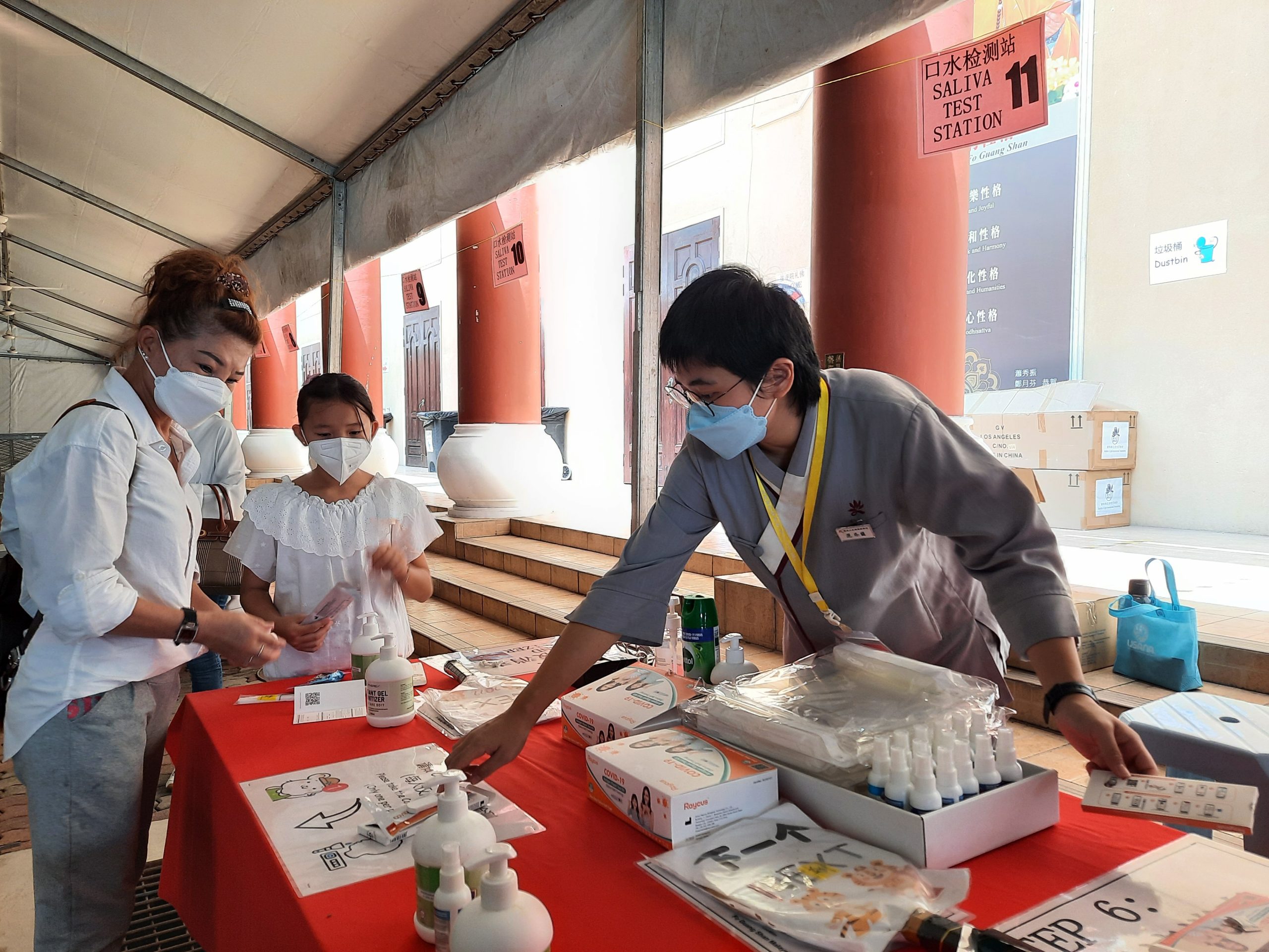 今年新春,我不再是獨自在家關注疫情人數的增減,而是以佛學院學生的身份在道場與大眾結緣。雖然疫情的好轉帶來了此次難得的因緣,但我們依然無法對病毒肆虐掉以輕心。2022年新春燈會期間,常住為遵守政府制定的防疫標準作業程式,設立了唾液快篩檢測站讓所有到訪者在入寺前進行檢測。而我除了要兼顧教育館,在人潮高峰期也要到檢測站協助。