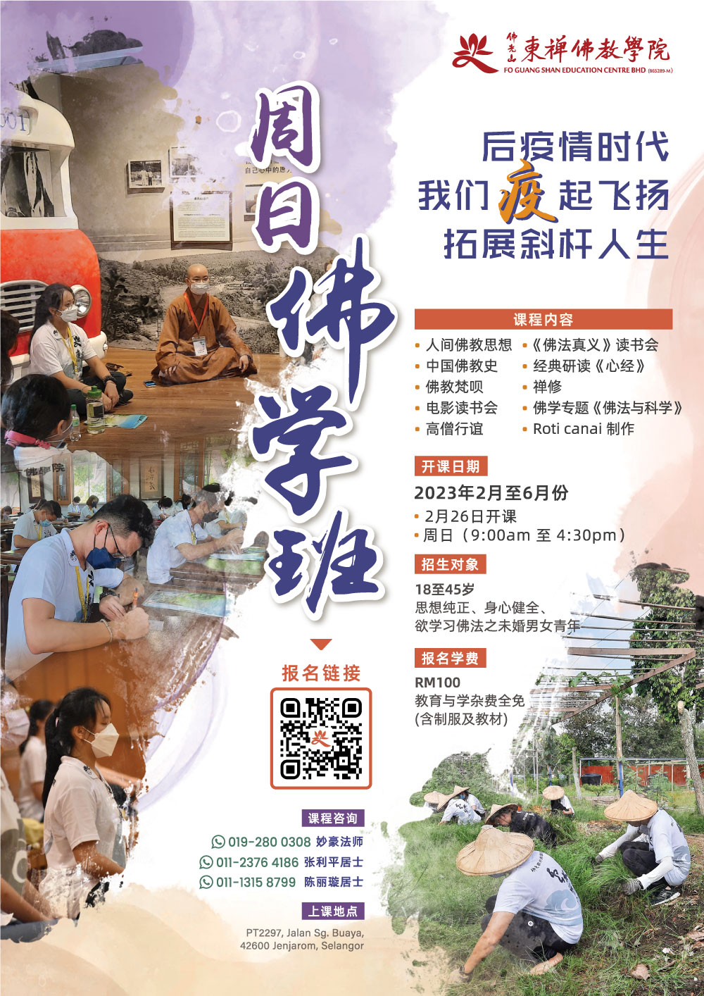 四、 课程内容:人间佛教思想、中国佛教史、佛教梵呗、电影读书会、高僧行谊、《佛法真义》读书会、经典研读《心经》、佛学专题《佛教与科学》、禅修、Roti canai 制作等。