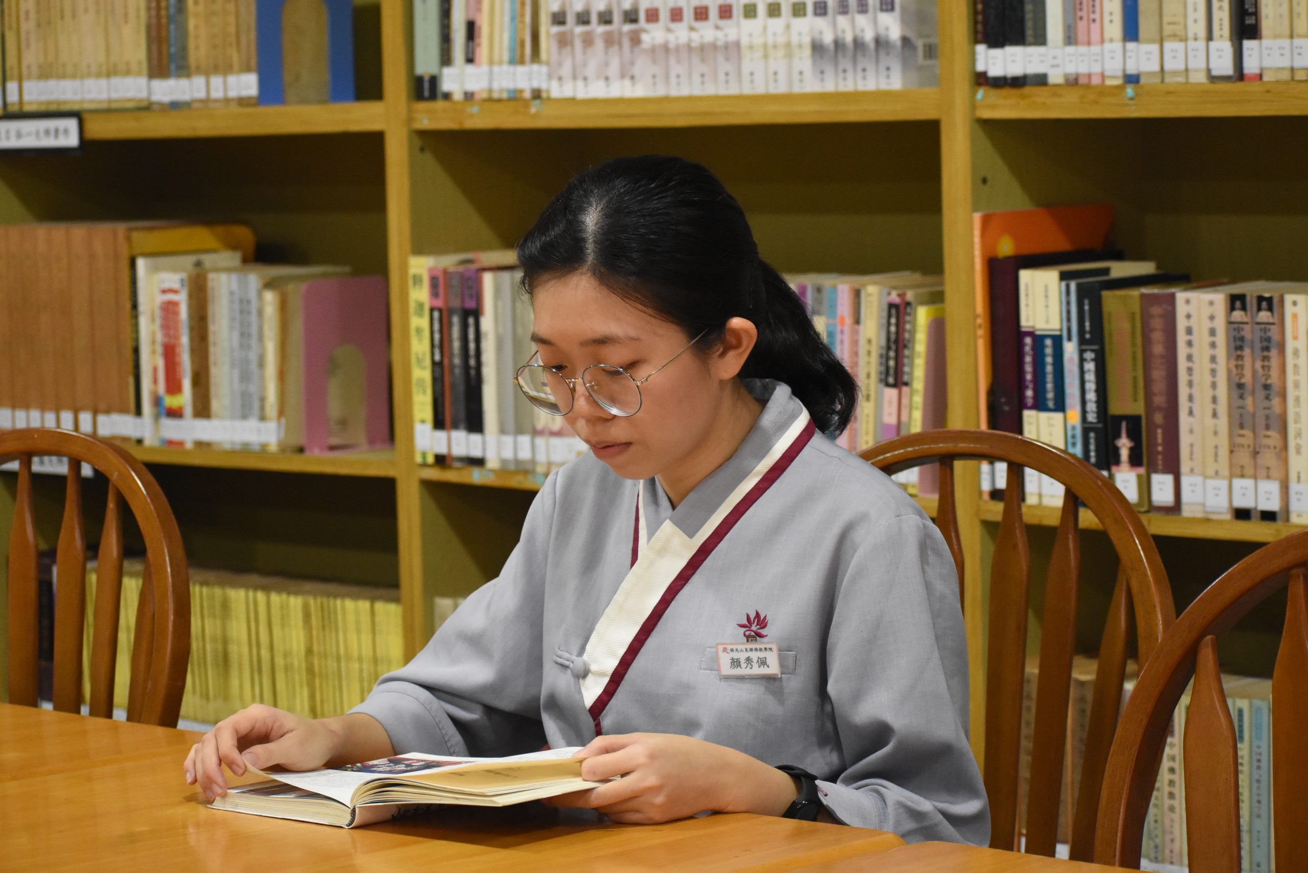 佛學院的生活很簡單,每天穿同樣的制服、吃著由大寮準備的營養三餐、依循固定的生活作息,減少了很多像是要穿什麼衣服、要吃什麼、要買什麼等生活的煩惱。適應了這裡的作息後,我有了更多時間去覺察自己的內心。每次上課前靜坐五分鐘,在排班和過堂吃飯時也都是禁語,從中讓我練習收攝身心,反觀自照。