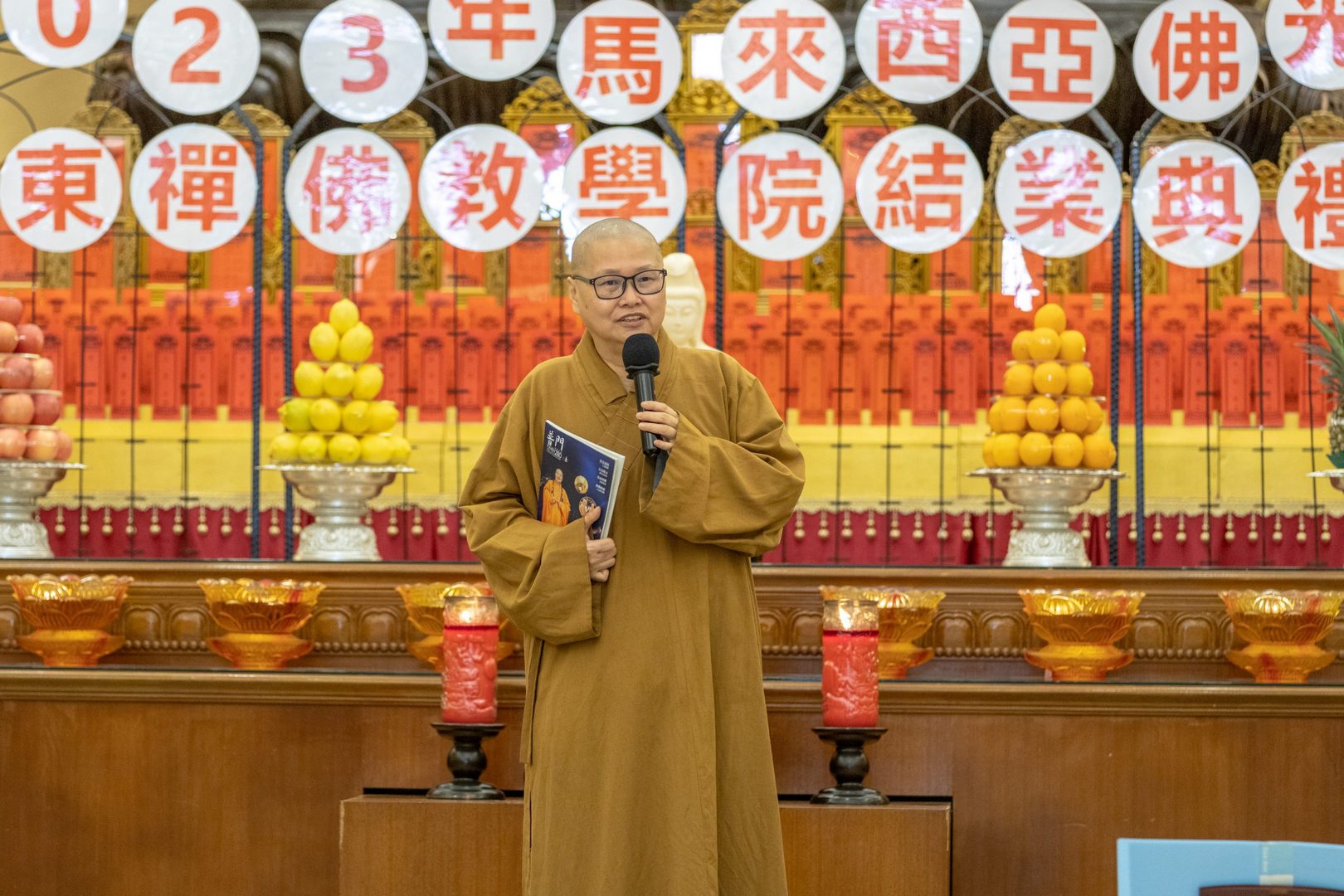 新馬泰印教區總住持暨東禪佛教學院院長覺誠法師表示,佛光山以教育起家,致力於培養佛教人才。大師提倡改革佛教,不只是老年人的宗教,而要吸引年輕人也能成為宗教老師。佛學院教育除了培養僧伽人才,在家眾畢業生也能在社會上服務,成為一股清流。他勉勵結業生要為未來的方向努力,健全自我,為佛教發光發熱。