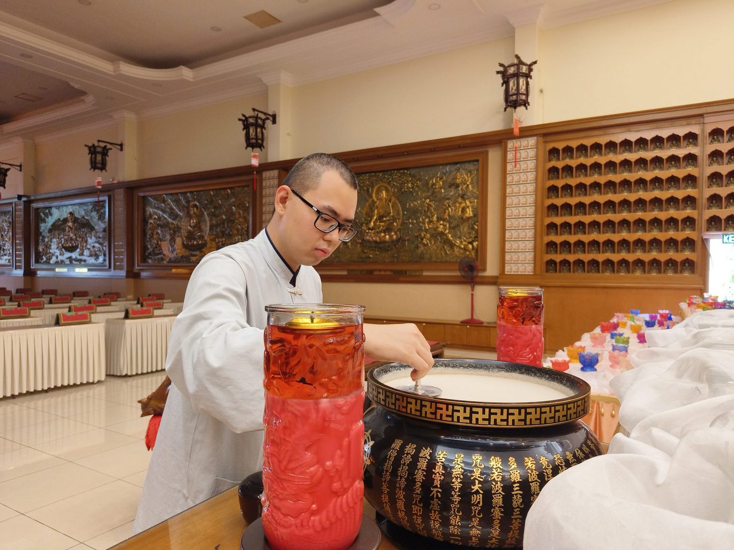 這一周的輪組工作輪到香燈組。所謂「一日之計在於晨」,天還未亮,大雄寶殿內已看見香燈人員忙碌的身影,正準備早課課誦事宜。從準備供飯供水、排經書和拜墊、上香、點燈、平爐、調好麥克風音量等,一切都馬虎不得。其中平爐和上香對我而言是非常挑戰的。平爐過程中,必須一心不亂,摒除雜念,平出來的香灰才會整齊。如何把香支插得間距一樣、直挺挺的,也是一門學問,因爲這會反映出自己當下的心境。此外,打起床板也是高難度挑戰之一。不但講求力道、打板位置的準確度、節奏性等因素,打出來的聲音要洪亮、厚實,才能夠把大衆從睡夢中喚醒上大殿做早課。