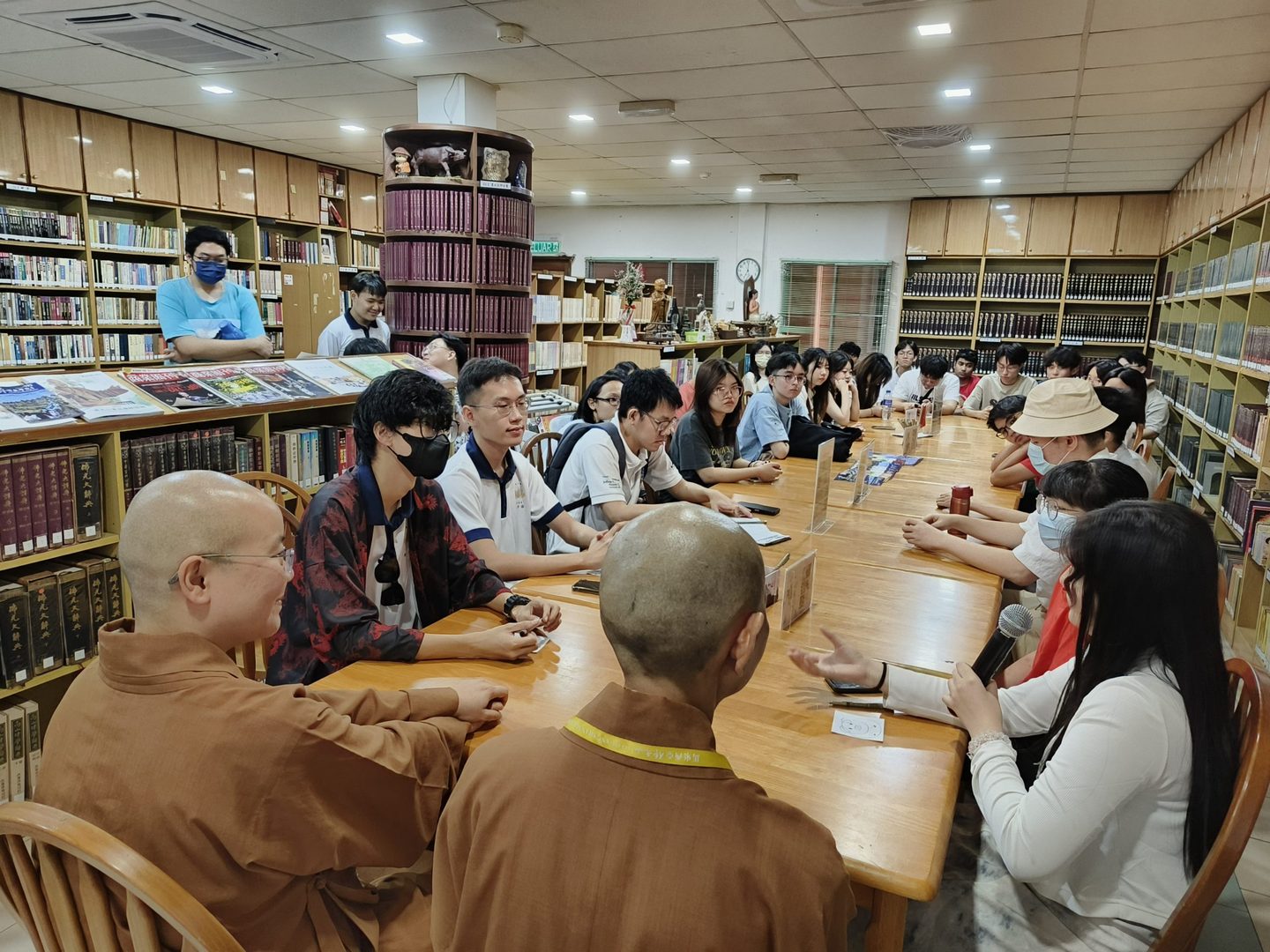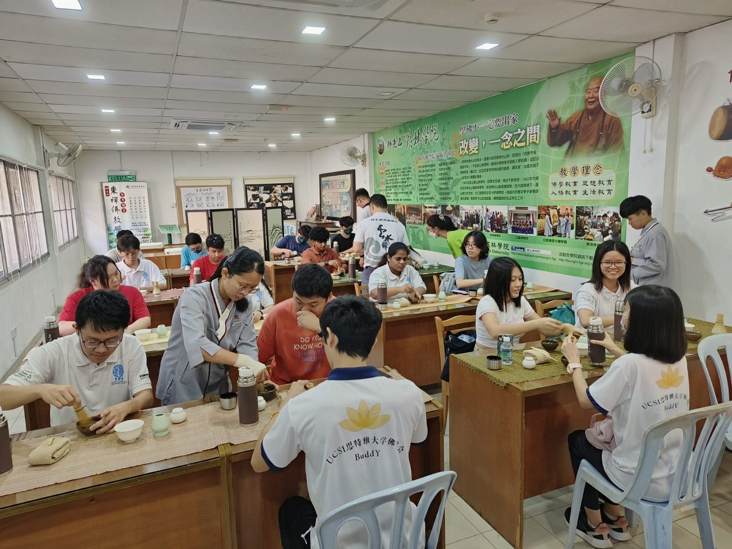 東禪佛教學院在燈會期間開放讓信衆前來參觀,認識佛光山教育體系。有別於往年,今年教育館特增設了一系列沉浸式體驗,讓大家瞭解專注力的重要性。大衆從宋代點茶的過程中學習沉澱身心;折豆腐乾棉被考驗大衆如何調伏內心;頂水禪則訓練走路的威儀;以及禪繞畫讓民衆放鬆心情,專注畫畫的當下。