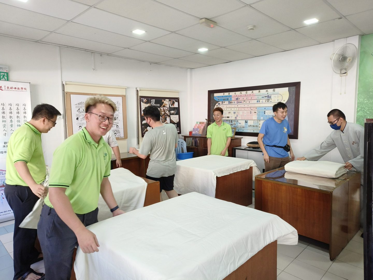 有一天晚上準備盥洗時,有位義工看到我手上拿著的衣服就問了一句:「你們裡面都要穿多一件衣服的嗎?」她這樣一問就讓我馬上想到當初剛來佛學院的自己,真的是完全不適應,因為我超級怕熱,之前在公司和家裏習慣吹冷氣。在新年期間,我被分配到兩個截然不同的崗位,一個是動一個是靜。從中也發現自己即使在水深火熱的美食街,我依然可以非常專注地把當下的任務做好,這在以前是不可能做到的。
