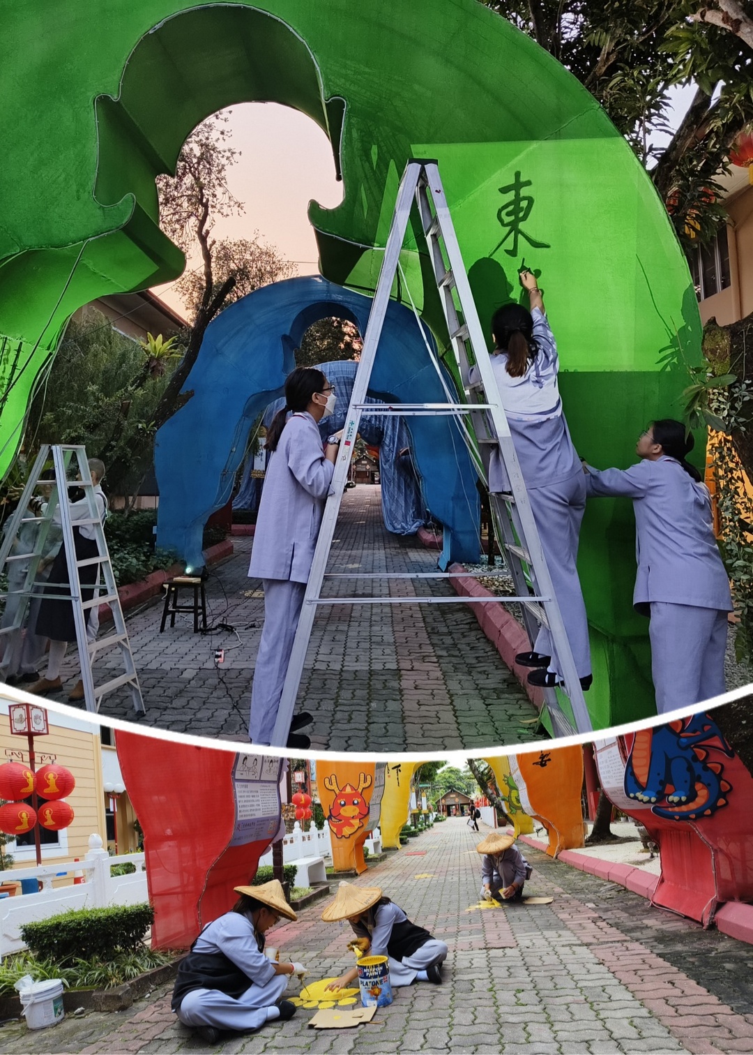 這次是生平第一次在寺院過年,佛學院同學也參與了常住的燈會籌備工作,在這次新年前的籌備工作與同學們一起參與拱門彩繪,義賣區和法務組的籌備;所參與的工作是過去不曾做過和無法想像自己可以體驗和完成的,在學習新事物的同時也在做著義工,意義非凡。