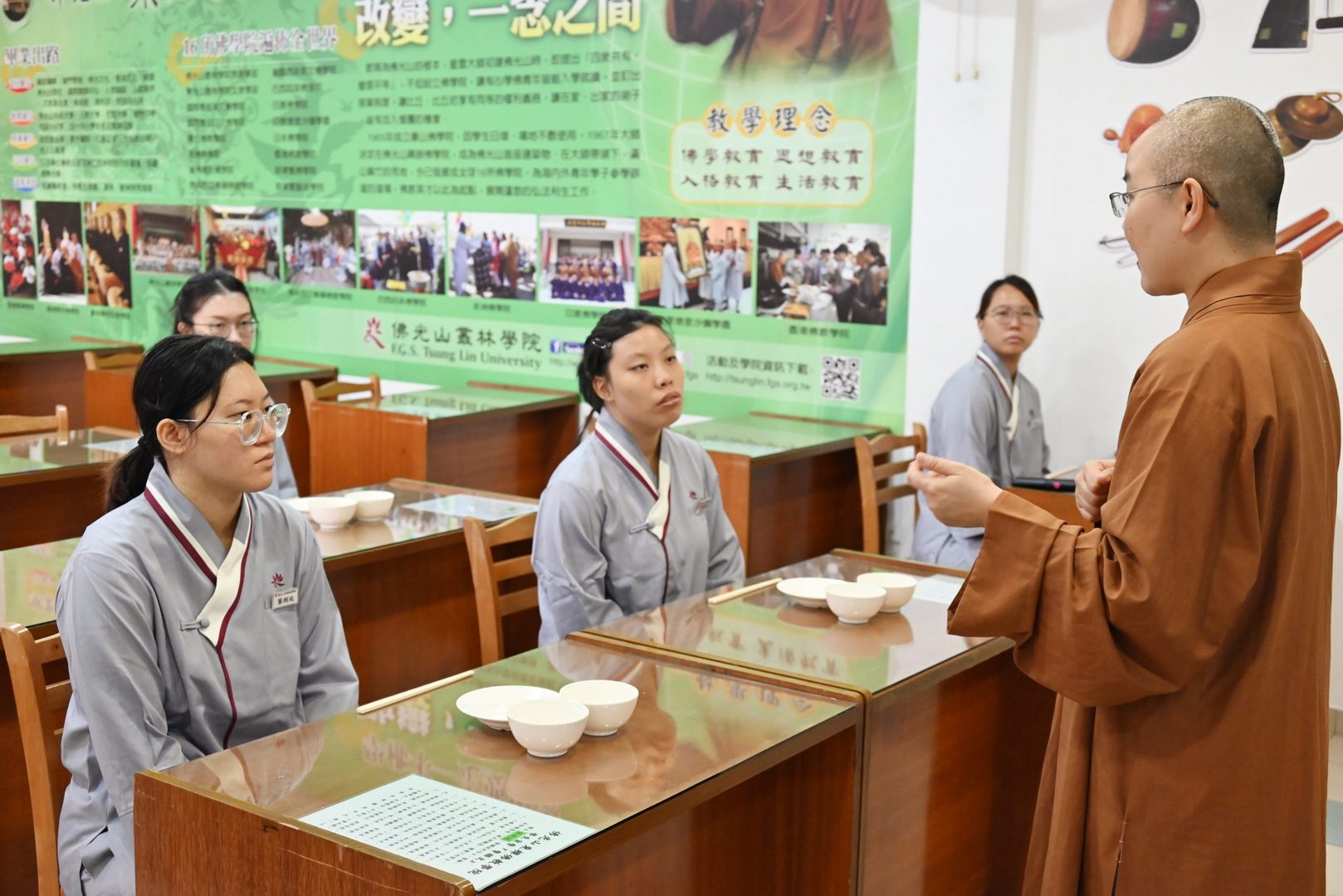 東禪寺副住持滿慧法師以佛典故事提醒大家不要被世間外在的假像所蒙蔽,應專注內在、找到真實的自己。他表示,有機會穿上佛學院的修道服在佛學院學習是殊勝難得的因緣。希望大家在佛學院找到自己,活得歡喜自在。