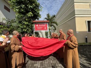 在揭牌儀式上,心保和尚鳴鑼祝福:「佛光普照,法輪常轉,招生滿滿!」並感謝印尼佛教聯合會總會長鄒麗英護法護教,惠借場地設立印尼佛教學院,為培養弘法人才提供堅實基礎。
